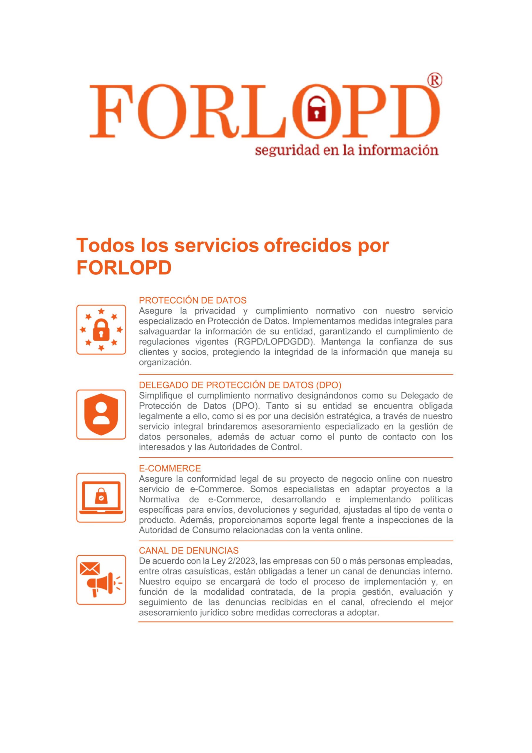 FORLOPD, Consultora de ámbito nacional e internacional especializada en el asesoramiento que garantice el cumplimiento normativo. Nuestro objetivo es fomentar una cultura de privacidad y seguridad de la información en todas las organizaciones, como valor empresarial; promoviendo prácticas responsables y sostenibles que generen confianza y transparencia. Buscamos evolucionar constantemente, adaptándonos a los cambios legislativos y tecnológicos para ofrecer siempre el mejor servicio a nuestros clientes.